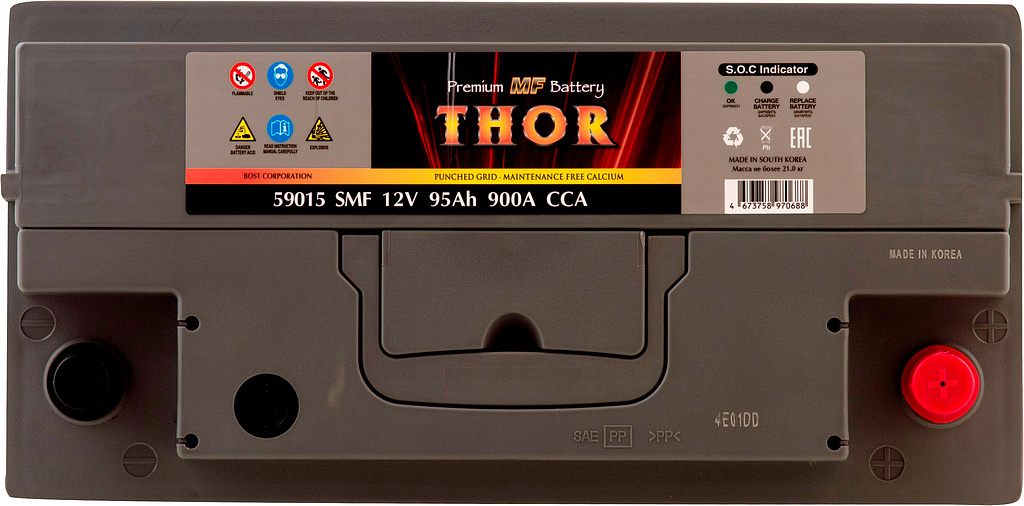 Автомобильный аккумулятор THOR SMF — серия аккумуляторов премиум-класса, выпускаемая заводом BOST CORPORATION (Южная Корея). Производитель применяет запатентованные технологии и материалы высокого качества, обеспечивая стабильную работу и продолжительный срок службы батарей.