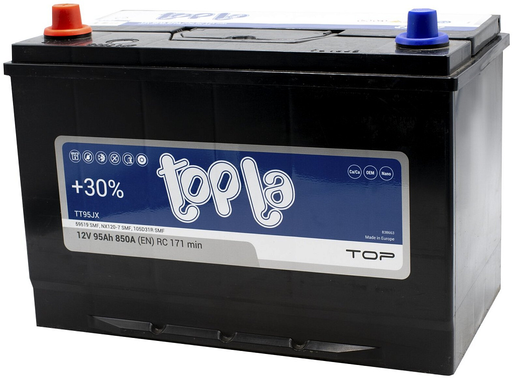 Автомобильный аккумулятор Topla Asia Top (Top Sealed JIS) производится в Словении на заводе концерна TАV (г. Межица). Эта аккумуляторная батарея относится к полностью необслуживаемым и сохраняет стабильные характеристики в течение всего срока эксплуатации.