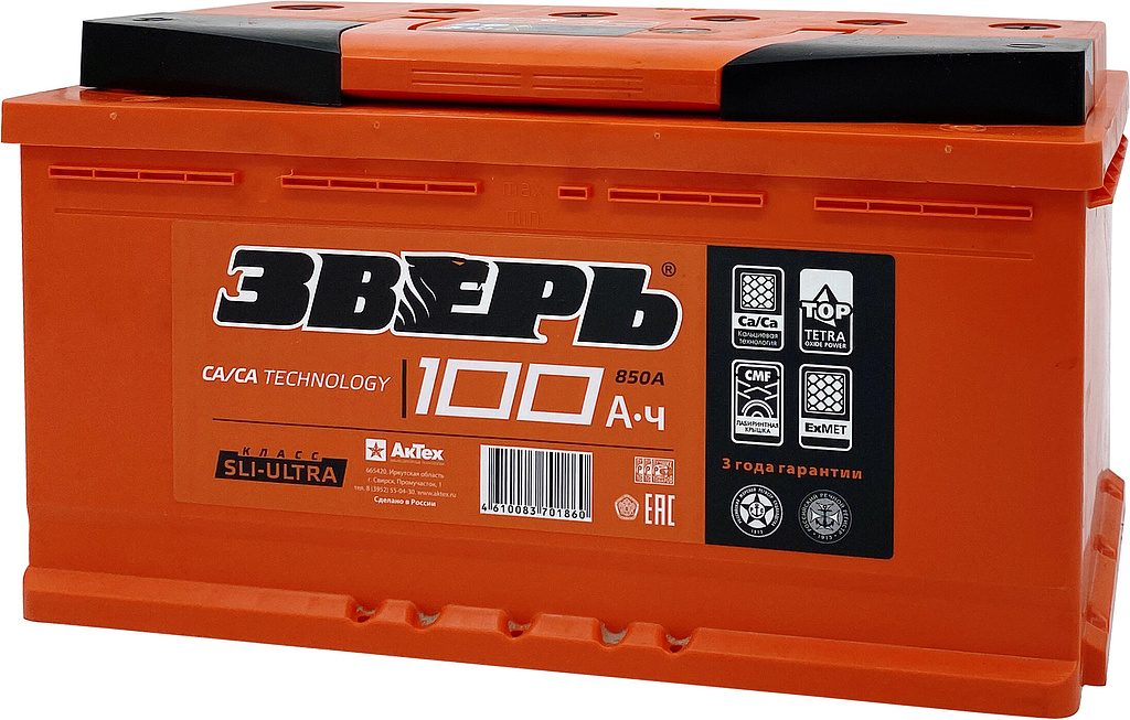 Аккумулятор ЗВЕРЬ 100 Ач 850 А прямая полярность