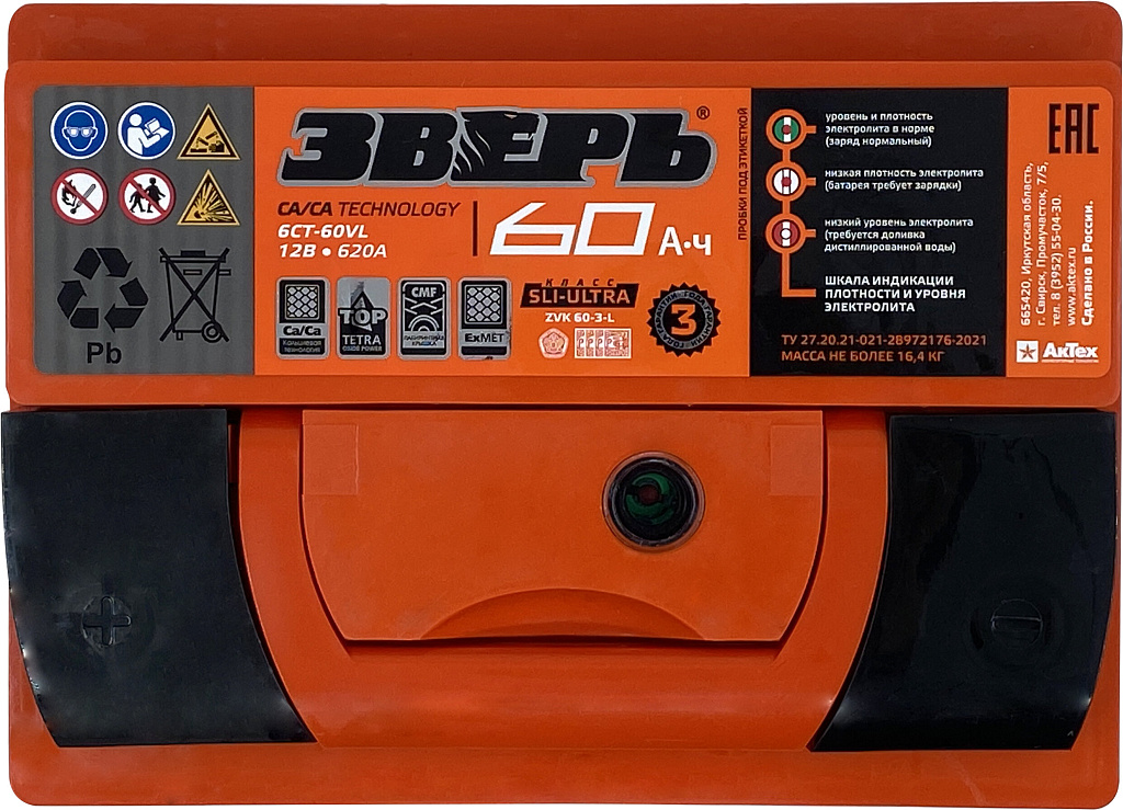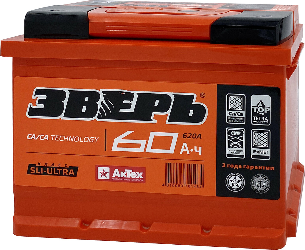 Аккумулятор ЗВЕРЬ 60 Ач 620 А прямая полярность